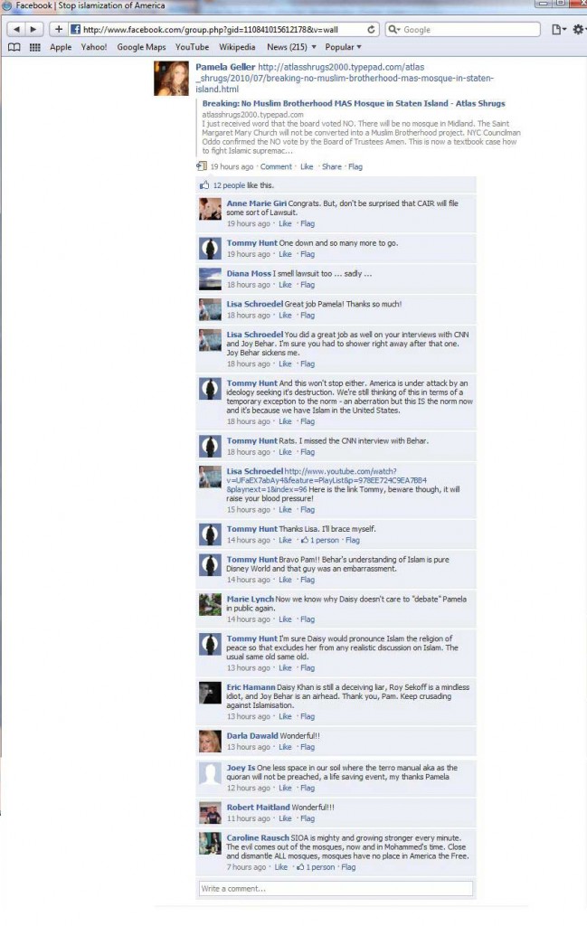 Screenshot of SIOA Facebook Leader and Supporters Comments on Decision to Stop Building Sale for Staten Island Mosque